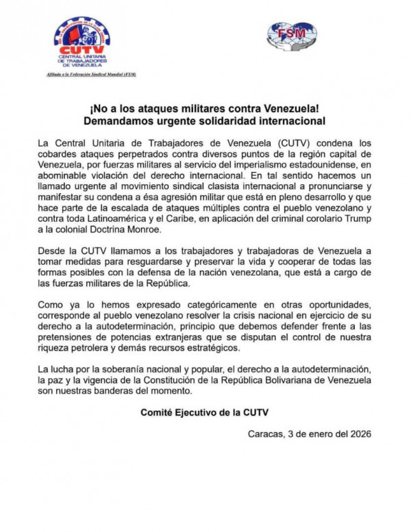 De Förenade Arbetarnas Centralorganisation (CUTV) fördömer de fega attackerna som begåtts mot olika platser i den venezuelanska huvudstadsregionen av militära styrkor som tjänar den amerikanska imperialismen, i ett uppenbart brott mot internationell rätt.